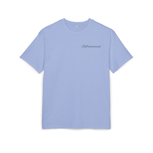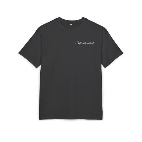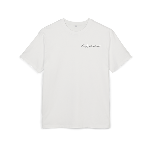 A subtle Self Possessed script sits at the chest — controlled.